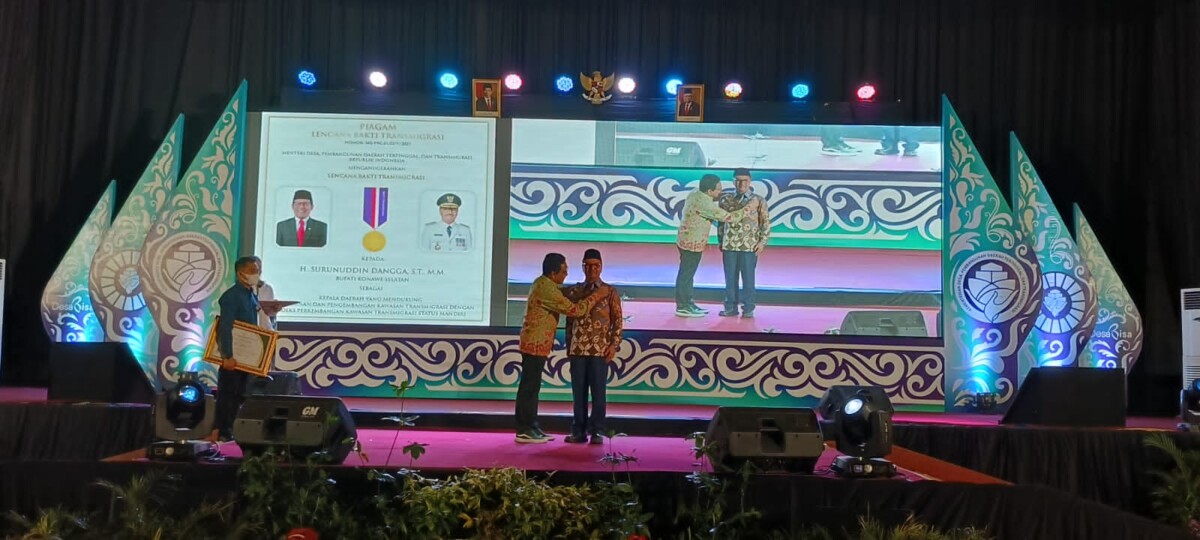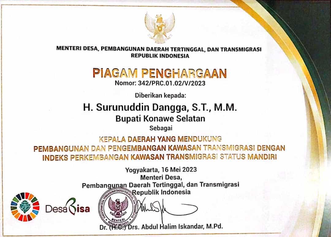 Merdekami.com _ Bupati Konawe Selatan, Provinsi Sulawesi Tenggara H Surunuddin Dangga menerima Lencana Bakti Transmigrasi dan Piagam Penghargaan sebagai Kepala Daerah yang Mendukung Pembangunan dan Pengembangan Kawasan Transmigrasi Dengan Indeks Perkembangan Kawasan Transmigrasi Status Mandiri.