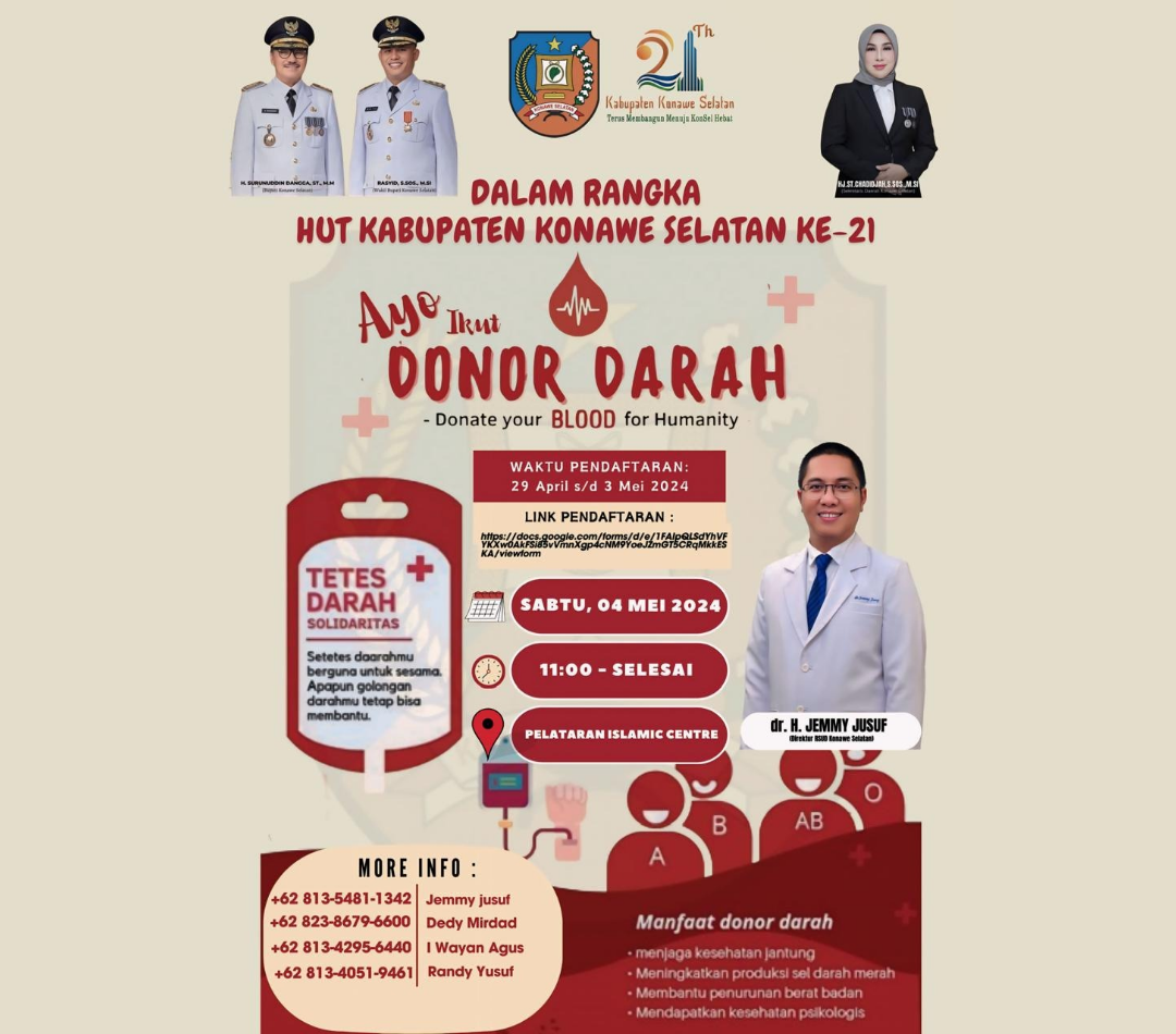 Sehingga persoalan ini dapat menjadi masalah bagi mereka yang sedang membutuhkannya. Olehnya itu, sebagai langkah strategis, Rumah Sakit Umum Daerah (RSUD) Kabupaten Konawe Selatan (Konsel) bakal menggelar aksi sosial Donor Darah.