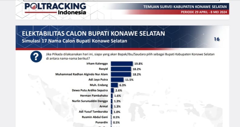 Merdekami.com -Beredar hasil survey Poltracking calon Bupati Konawe Selatan perseorangan. Formula calon bupati tersebut melibatkan banyak figur di Konsel.
