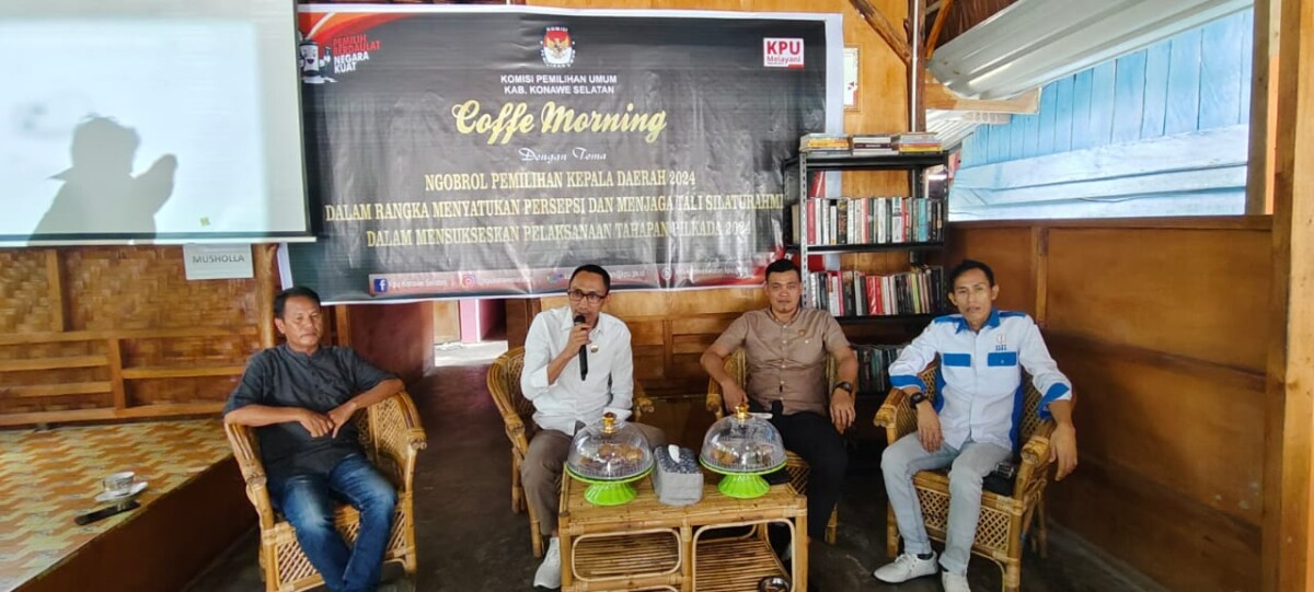 Merdekami.com – Komisi Pemilihan Umum (KPU) Konawe Selatan menggelar Coffee Morning untuk menyatukan persepsi dan menjaga silaturahmi dalam mensukseskan pelaksanaan tahanan Pemilihan Kepala Daerah (Pilkada) tahun 2024.