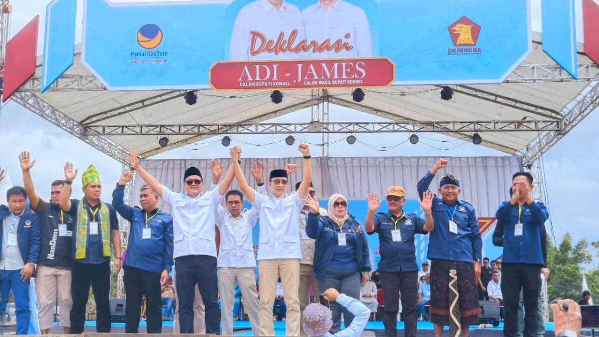 Merdekami.com – Pasangan bakal calon Bupati dan Wakil Bupati Konsel, Adi Jaya Putra (AJP) dan James Adam Mokke, resmi mendeklarasikan pencalonan mereka di hadapan ribuan simpatisan pada Selasa, 28 Agustus 2024. Deklarasi ini berlangsung di halaman Gedung Islamic Centre Andoolo.