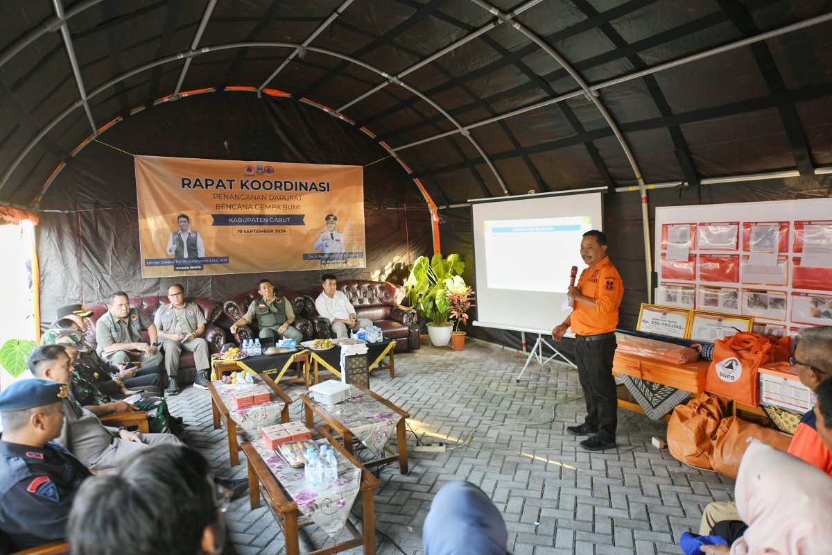 “Pelatihan, sosialisasi, itu sangat penting,” ujar Bey Machmudin saat Rakor Penanganan Darurat Gempa Bumi Kabupaten Garut, di kantor Kecamatan Pasirwangi, Kabupaten Garut, Kamis (19/9/2024).