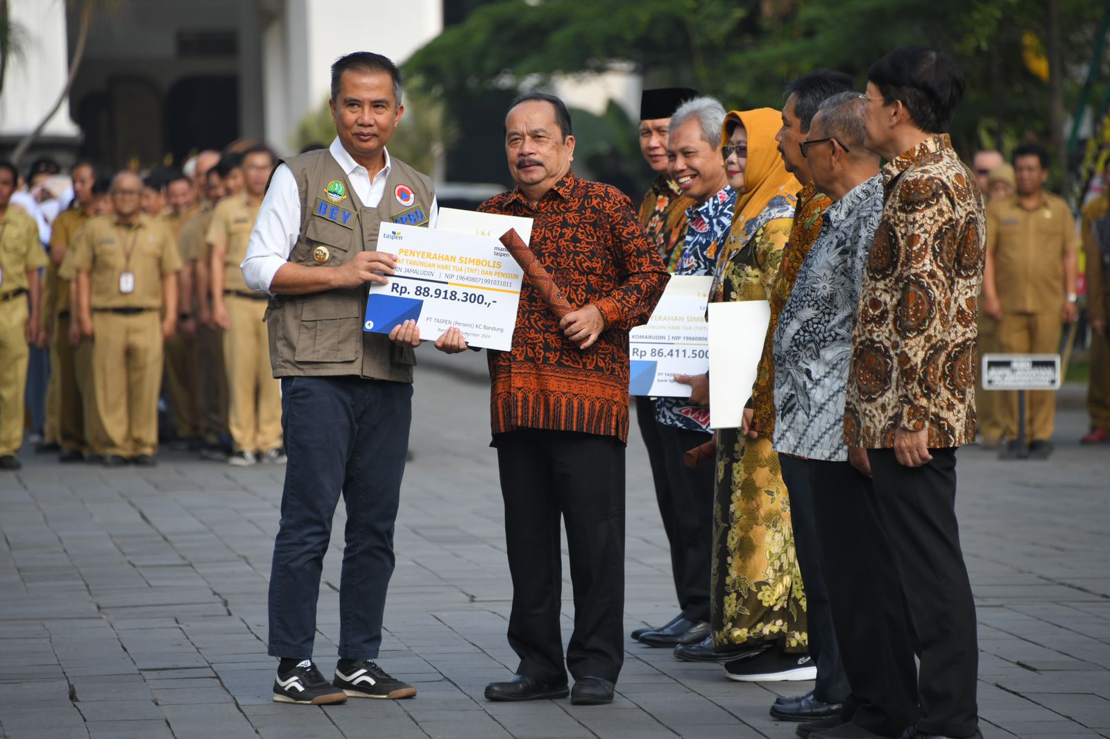 Mereka menerima SK (surat keputusan) pensiun yang dilakukan secara simbolis pada apel pagi yang dipimpin Penjabat Gubernur Jawa Barat Bey Machmudin di halaman depan Gedung Sate, Kota Bandung, Senin (2/9/2024).