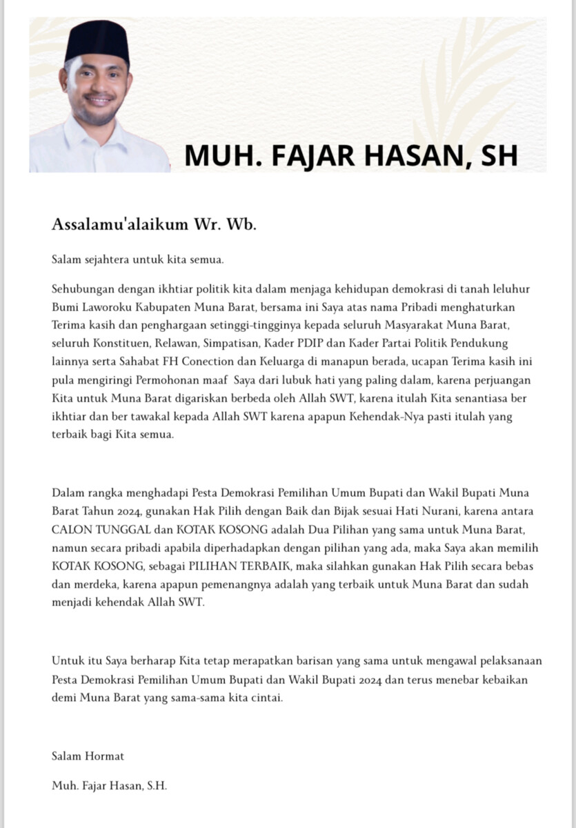 “Namun secara pribadi apabila diperhadapkan dengan pilihan yang ada, maka Saya akan memilih KOTAK KOSONG, sebagai PILIHAN TERBAIK, maka silahkan gunakan Hak Pilih secara bebas dan merdeka, karena apapun pemenangnya adalah yang terbaik untuk Muna Barat dan sudah menjadi kehendak Allah SWT” tuturnya.