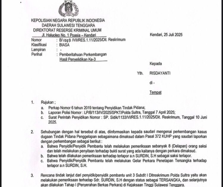 Penetapan tersangka ini diumumkan Unit 3 Subdit I Direktorat Reserse Kriminal Umum (Ditreskrimum) Polda Sultra melalui Surat Pemberitahuan Perkembangan Hasil Penyidikan (SP2HP) yang diterima pelapor, Risdayanti (36), warga Desa Laonti. Surdin dijerat dengan Pasal 372 KUHP tentang tindak pidana penggelapan.