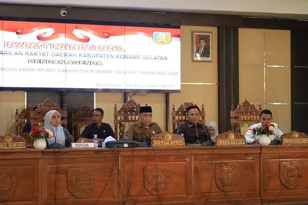 Konawe Selatan, Merdekami.com – Dewan Perwakilan Rakyat Daerah (DPRD) Kabupaten Konawe Selatan menggelar Rapat Paripurna penyerahan Rancangan Akhir Rencana Pembangunan Jangka Menengah Daerah (RPJMD) 2025–2029 di Aula Utama DPRD Konsel, Selasa (5/8/2025).